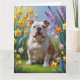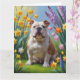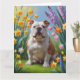 Un perro alegre se sienta pacíficamente en un césped verde exuberante, rodeado de coloridas flores primaverales bajo un suave cielo azul. Esta pintura digital al óleo captura un momento sereno con pinceladas expresivas, colores cálidos y una sensación de alegría suave.