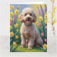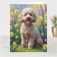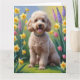Un perro alegre se sienta pacíficamente sobre una exuberante hierba verde, rodeado de coloridas flores primaverales bajo un suave cielo azul. Esta pintura digital al óleo captura un momento sereno con pinceladas expresivas, colores cálidos y una sensación de alegría suave.