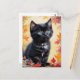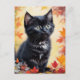 Esta pintura de acrílico muestra un lindo gatito negro al aire libre en temporada de otoño, rodeado de hojas cambiantes de rojo, naranja, amarillo. Un retrato otoñal de un felino adorable perfecto para el otoño o en cualquier momento, ¡realmente! Para los fanáticos de los gatos negros, gatitos en general y la temporada de otoño.