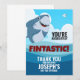Envíe a sus huéspedes una carta FINTASTIC personalizada Gracias con esta adorable tarjeta plana 5X7 con fondo azul del océano, cielos de verano y un feliz personalizado de tiburones. Las letras brillantes y audaces asegurarán que todos los destinatarios se sientan agradecidos por compartir en el evento especial de su hijo. Ideal para todos los amigos amantes del mar.