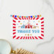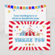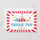 El diseño presenta un fondo rojo y gráficos de carnaval. Escribe tu propia nota de agradecimiento sobre el texto de muestra o elimínalo para escribir a mano tu propio mensaje personal en la parte posterior. Para acceder a herramientas de edición avanzadas, vaya a “Personalizar”, desplácese hacia abajo y presione el enlace "haga clic para personalizar aún más".