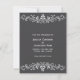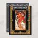 Tarjeta de aviso de fecha de boda con dorso gris. La parte delantera representa la danza de Alphonse Mucha. La parte trasera contiene dos florituras con los detalles personalizados de la próxima boda prevista.