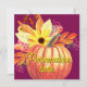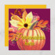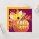 Fondo de color violeta profundo adornado con calabaza naranja y girasol con hojas multicolores. Una carta de otoño bonita y audaz. La personalización es opcional al principio y al final