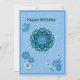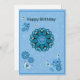 Feliz cumpleaños mandalas, tarjeta de saludo, con mariposas y flores para ella o él. Motivos verde azulados de fondo azul y blanco
