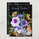 Encuentra esta linda tarjeta de vacaciones de Pascua con rosas y flores azules moradas en un fondo negro con tonos de rosa y verde.
