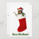 Este adorable ratoncito está listo para las fiestas con su sombrero rojo y blanco. Está metido dentro de su calcetín de Navidad, con bastón de caramelo, esperando a Santa Claus. Este diseño es genial para niños, jóvenes y viejos. En la parte posterior de la tarjeta hay un cuadro de texto que te permite agregar tu propio mensaje de vacaciones. Si lo prefieres, puedes eliminar el cuadro y escribir tu mensaje.