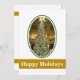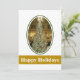 Decora los pasillos y recorta los árboles. Tomé esta foto en Marshall Fields Department Store, State Street Chicago, Illinois (EE. UU.). El gran árbol mide alrededor de nueve pisos de altura. Esta foto vintage, circa 1980, está colocada sobre un fondo blanco con un marco verde. Debajo de la foto hay una banda de color dorado y texto que dice "Felices Fiestas". Todo el texto en esta tarjeta se puede personalizar