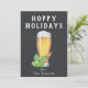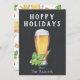 Vaso de cerveza pintado, lúpulo y trigo en pizarra de tiza negra con patrón de pub coincidente en el reverso, tarjeta divertida de "Felices Fiestas Hoppy".