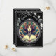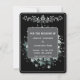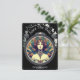 Tarjeta de guardar la fecha de boda con diseño floral en negro. La parte delantera representa un diseño de mujer al estilo Mucha. La parte trasera contiene los detalles personalizados de la próxima boda prevista.