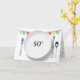 Platos blancos y cubiertos de plata en blanco con una bandera de color fiesta para los 50 años.