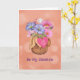 "Flores para mi Valentine" presenta un ramo de flores pequeñas y delicadas, envueltas en arpillera. El ramo tiene flores rosas y azules y la etiqueta en forma de corazón dice "Te amo". El texto en el frente y en el interior se puede personalizar.
