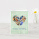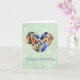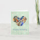 Una tarjeta de cumpleaños con un diseño de acuarela de plumas en forma de corazón. Los colores incluyen amarillo, naranja, azul, verde y marrón. Algunas tienen rayas, puntos, patrones tribales y otras disposiciones decorativas creativas únicas. Puesto en un fondo vintage verde menta con lunares rosados y blancos descoloridos. El mensaje de cumpleaños interior se puede personalizar según tu estilo.