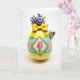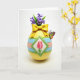 This design shows a rounded, egg-shaped decorative piece centered on a white background, lit evenly so the soft curves look gentle and inviting, like a quiet gift between close friends. At the top sits a cluster of lavender flowers with green leaves reaching upward, giving the scene a fresh spring look 🌷. Just below, a shiny yellow bow wraps the form, adding a cheerful accent that feels like a small, affectionate touch. The egg’s surface is painted in a soft yellow base with horizontal bands of pastel blue and rose pink, each sprinkled with tiny white dots that read like confetti. In the middle, a raised green square frame draws attention to a stylized flower with a two-tone bloom and a slim green stem, similar to a tulip. Off to one side, a small winged insect rests as if pausing near the “gift,” its patterned wings mixing yellow, blue, red, and orange 🐇. No written text appears on the object, leaving the colors and shapes to do all the talking. The final detail is the little insect perched near the edge of the egg, angled slightly outward so its patterned wings are easy to see.