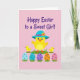 This card shows a cheerful spring scene with a round yellow bird centered on a soft warm pink background, gazing forward with wide eyes and a tiny orange beak. It wears a sky-blue wide-brim hat trimmed with a bright pink ribbon and a small yellow flower, giving it a dressed-up look that feels like it’s ready for a friendly outing. Two smaller yellow birds stand close on either side, angled slightly inward as if keeping the middle bird company in a sweet, companionable moment 🐇. Along the bottom, five decorated eggs sit nestled in short green grass, their polka dots adding a gentle rhythm across the row. The eggs are colored in pastel shades of blue, teal, purple, orange, and rosy pink, balancing the pink backdrop with cool and warm tones. Near the top, a seasonal greeting appears in deep violet lettering, centered above the birds and easy to spot 🌷. The background stays simple with flat color areas and minimal texture so the characters and eggs stand out clearly. The hat’s pink ribbon curves around the brim, and the small yellow flower sits on one side like a neat accent.