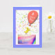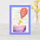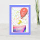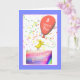 Una linda y festiva tarjeta de cumpleaños con mi diseño de un pequeño pollo parado en una torta de cumpleaños sosteniendo un globo que dice "¡3 años!" con mi verso dentro.