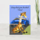 Que tu amigo que ha estado en un accidente sepa que te importa una tarjeta con una adorable jirafa con su cuello vendado sentado detrás de un auto azul. La jirafa, el coche por los diseños digitales de Elena