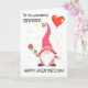 Una divertida tarjeta de saludo El día de San Valentín para tu novia, con un lindo gnomo, vestido de rojo, sosteniendo una sola rosa roja en una mano y un globo rojo con forma de corazón en la otra mano. Este popular gnomo al estilo escandinavo es pequeño y regordete, con una enorme barba blanca que llega al suelo y un alto gorra que le bajan los ojos para que todo lo que podemos ver de su cara sea su nariz grande y rosa. Hay un corazón decorativo colgando de la punta de su gorra y su banda de color dorado tiene X rojas para besos alrededor. El saludo de portada, con una letra negra y divertida, es: "Para mi maravillosa NOVIA, ¡FELIZ DÍA DE VALENTINE!" El fondo es blanco, con una dispersión de pequeños corazones dorados pálidos. El mensaje interior es sólo una sugerencia y puede cambiarlo o borrarlo por completo si está buscando una tarjeta "interior en blanco".