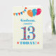 Una tarjeta de cumpleaños colorida para un ahijado de 13 años, El gran número 13 está lleno de un patrón naranja, rojo y azul, delineado en azul brillante. Hay globos y racimos en la parte superior, con colores que coinciden y el saludo de la portada es, "Godson, ¡hoy tienes 13 años!", con letras brillantes rojas y azules, en un fondo de puntos de polka amarillo y blanco muy pálido, con estrellas rojas y naranjas a cada lado de la palabra '¡HOY!'. El mensaje interno se puede personalizar o borrar fácilmente si lo desea.