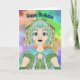 Tarjeta de 13 años para tu bisnieta. Este es un diseño pintado y dibujado a mano con un joven chica en la parte delantera con el pelo verde azulado y dorado, y un traje verde y una bufanda. El fondo está pintado a mano y colorido. El año se puede cambiar en el interior de la tarjeta.