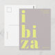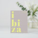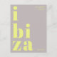 Envía un saludo con estilo desde las Islas Baleares con esta postal modernista y tipográfica de Ibiza, España. El diseño presenta la palabra Ibiza dividida en tres líneas en negrita y letras minúsculas decorativas, en amarillo claro sobre un fondo gris neutro. Arriba, la frase saludos desde está escrita en una fuente sans serif delgada y elegante, añadiendo un toque sutil y moderno. Perfecta como recuerdo de vacaciones, un acento decorativo o para enviar a casa desde tu escapada a la isla. Un diseño minimalista pero llamativo para los amantes de la estética contemporánea y los recuerdos de viaje.