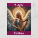 En esta tarjeta postal del Navidad se muestra una hermosa imagen de un ángel mirando hacia arriba, mientras tocaba el arpa. En la parte delantera de la postal se puede leer "Un Navidad alegre" y en la parte trasera de la tarjeta postal, "¡Para ti y tu familia, un bendito año nuevo también"! ¡Una preciosa postal para enviar a familiares y amigos por Navidad!