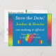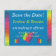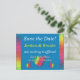 Un diseño simple pero elegante que pone la información importante al frente y al centro de una manera fácil de leer. El fondo sólido bordeado por un toque de color de arcoíris hace que esta tarjeta postal sea difícil de pasar por alto en el buzón. ¡Elige cualquier color que te guste para el fondo (mostrado aquí con un azul crepuscular en el frente y blanco en la parte posterior)! La parte trasera está pre-formateada tanto para la dirección de devolución como para la del destinatario. Si prefiere escribir a mano sus "Save the Dates", simplemente deje los campos de dirección del destinatario en blanco. Utilice los campos de plantilla proporcionados para personalizar rápidamente con su información. Haga clic en "personalizar más" para cambiar la fuente, el tamaño, los colores y las posiciones.
