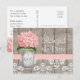 Esta bonita y rústica tarjeta postal de cambio de fecha de hortensia rosa es perfecta para que la novia celebre con una boda con tema campestre o granja o una despedida de soltera. Inicial el tarro de Mason con las iniciales de la novia y el novio. La parte trasera de la tarjeta tiene un fondo de aspecto de madera, diseño de encaje damasco y cinta. Diseñado por Chrissy H. Studios, LLC. Cambie el texto para que diga lo que quiera.