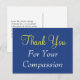 Este diseño clásico de tarjeta postal de agradecimiento presenta el mensaje "Gracias por su compasión" en la parte delantera, junto con un mensaje personalizado en la parte posterior. Podría ser utilizado para mostrar gratitud a alguien que ha hecho un acto especial.