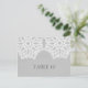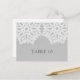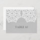 Sencilla y sofisticada tarjeta postal con el Boda elegante de encaje con un motivo de doily encaje blanco sobre un fondo de papel pintado de imitación gris claro. Esta carta clásica y elegante es perfecta para un boda rústico. Fácil de personalizar con los números de tabla correspondientes. Haga clic en "Personalizar" para encontrar más opciones de personalización.
