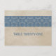 Sencilla y elegante tabla de encaje rústico número postal con un fondo de papel texturado vintage y un borde de encaje dulce y delgado en azul oscuro. Fácil de personalizar, simplemente agregue los números de tabla apropiados en el campo de texto proporcionado. Haga clic en "Personalizar" para encontrar más opciones de personalización.