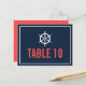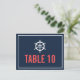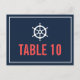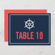 Número de la mesa de la Marina y el Coral Nautical Helm Postcard azul marino oscuro y coral gracias tarjeta con un ilustracion de casco blanco. Es perfecto para bodas náuticos o bodas con temática marina y oceánica.