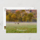 Tarjeta postal de agradecimiento que presenta a una pareja de alces pastando en un campo en una fría mañana de otoño con algo de niebla persistente. El gran alce macho come hierba mientras la hembra observa. Esto está en Boxley Valley, Arkansas, EE. UU.