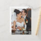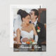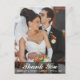 Tarjeta postal de agradecimiento de boda de la novia y el novio con escritura blanca larga