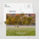 Tarjeta postal de agradecimiento que presenta a una pareja de alces pastando en un campo en una fría mañana de otoño con algo de niebla persistente. El gran alce macho come hierba mientras la hembra observa. Esto está en Boxley Valley, Arkansas, EE. UU.