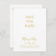 Esta tarjeta postal de ahorro de fecha de boda simple y elegante en dorado es perfecta para su boda moderna minimalista en blanco y dorado. El diseño cuenta con una fuente dorada contemporánea minimalista acompañada de caligrafía formal. Manténgala como está o personalícela con su propio arte o fotos.