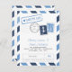 Tarjeta de Fecha de Boda Inspirada en Correo Aéreo en Azul Marino y Azul Pastel. Sello Falso y Marcas de Franqueo para una Boda con Tema de Viajes y Náutico.