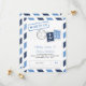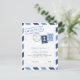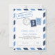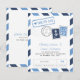Tarjeta de Avisa de Fecha de Boda Inspirada en Correo Aéreo en Azul Marino y Azul Claro. Sello Falso y Marcas de Franqueo para una Boda con Tema de Viaje y Náutico.