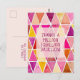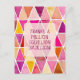 Formas de diamante pintadas a mano con acuarela en tonos rosados, melocotones y dorados forman el fondo de esta tarjeta postal de agradecimiento. En la parte posterior de la tarjeta se encuentra un mensaje especial, todo fácilmente modificable.