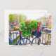 Esta tarjeta postal presenta una escena desde lo alto de un puente en Amsterdam, con flores brillantes y hermosas, y bicicletas aparcadas a lo largo del borde. Se pueden ver edificios al fondo.