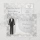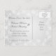 Tarjeta postal de anuncio de boda con esmoquin y vestido de gala sobre un fondo de copos de nieve plateados