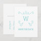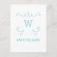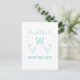 Tarjeta postal de anuncio de boda con monograma de floritura caprichosa moderna y sencilla que presenta un motivo de remolino elegante en turquesa. Fácil de personalizar, simplemente agregue su inicial y los detalles de la boda en los campos de texto proporcionados. Haga clic en "Personalizar" para encontrar más opciones de personalización.