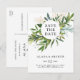 Esta elegante tarjeta postal de anuncio de boda con follaje de olivo es perfecta para tu boda boho moderna de verano. Está diseñada con hojas de color verde esmeralda pintadas a la acuarela y de color salvia, toques de oro botánico, flores de olivo rosadas y tipografía negra vintage sencilla. Todos estos elementos se combinan para dar un toque bohemio hermoso.