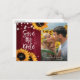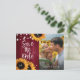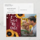 Tarjeta postal de anuncio de boda rústica con girasoles y luces de cuerda sobre un fondo de madera rústica, ideal para una boda campestre o de granero inspirada en girasoles y con detalles en borgoña.