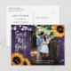 Tarjetas postales de anuncio de fecha de boda con diseño floral rústico con girasoles y luces de cuerda sobre fondo de madera de granero. Diseño de tarjeta ideal para una boda rústica morada inspirada en girasoles. Tarjeta postal de anuncio de fecha de boda con monograma.