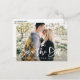 Tarjeta postal de anuncio de fecha de boda con letra blanca y foto. Tarjeta postal personalizable con foto y letra blanca a mano con patrón de follaje de acuarela.