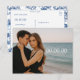 ¿Buscas una forma elegante de anunciar tu boda? Esta tarjeta postal de "save-the-date" de foto personalizable te permite subir tu foto de compromiso favorita mientras mantiene el diseño pulido y moderno. Con una elegante colocación de tipos que se adapta a la ropa oscura y a los entornos de playa, el reverso muestra un patrón atemporal azul de chinoiserie para un acabado clásico. Perfecta para bodas en la costa, parejas modernas o cualquiera que desee un toque refinado y personal.