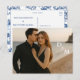 ¿Buscas una forma elegante de anunciar tu boda? Esta tarjeta postal de "save-the-date" personalizable te permite subir tu foto de compromiso favorita mientras mantiene el diseño pulido y moderno. Con una elegante colocación de tipos que se adapta a la ropa oscura y a entornos de playa, el reverso muestra un patrón atemporal en azul chinoiserie para un acabado clásico. Perfecta para bodas en la costa, parejas modernas o cualquiera que desee un toque refinado y personal.