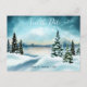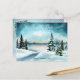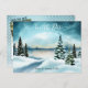 Elegante tarjeta postal de anuncio de fecha con una pintura de acuarela de un paisaje invernal en la parte delantera y tu propia foto favorita enmarcada por un diseño de lunares azules en la parte trasera.