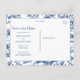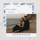 ¿Buscas una forma elegante de anunciar tu boda? Esta tarjeta postal de guardar la fecha con foto personalizable te permite subir tu foto de compromiso favorita mientras mantiene el diseño pulido y moderno. Con una elegante colocación de tipos que se adapta a la ropa más oscura y a entornos de playa, el reverso muestra un patrón atemporal azul de chinoiserie para un acabado clásico. Perfecta para bodas en la costa, parejas modernas o cualquiera que desee un toque refinado y personal.