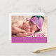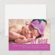 Una tarjeta postal de anuncio de bebé simple y moderna en color púrpura malva. Personalice con los detalles de su bebé y una foto especial de su nueva hija. Una excelente manera de anunciar la llegada de su nuevo bebé a familiares y amigos. Diseñado por www.mylittleeden.com